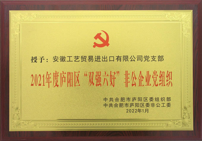 近日,我司黨支部被中共合肥市廬陽區委組織部和中共廬陽區委非公工委聯合授予2021年度廬陽區“雙強六好”非公企業黨組織光榮稱號。榮譽的獲得是公司全體黨員共同努力的結果。公司黨支部希望廣大黨員珍惜榮譽,繼續努力,積極響應上級黨組織的號召,牢記黨的宗旨,擔當時代使命,爭當公益活動的志愿者。充分發揮安徽工藝貿易進出口有限公司黨支部的戰斗堡壘作用,奮力進取,使公司的各項工作再上一個臺階。