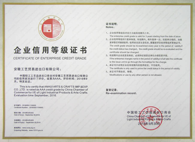 ? ? 公司繼2009年首次獲評企業信用評價AAA級信用企業后,連續多次獲評AAA級榮譽, 并于今年再次被中國輕工工藝品進出口商會授予AAA級信用企業證書。