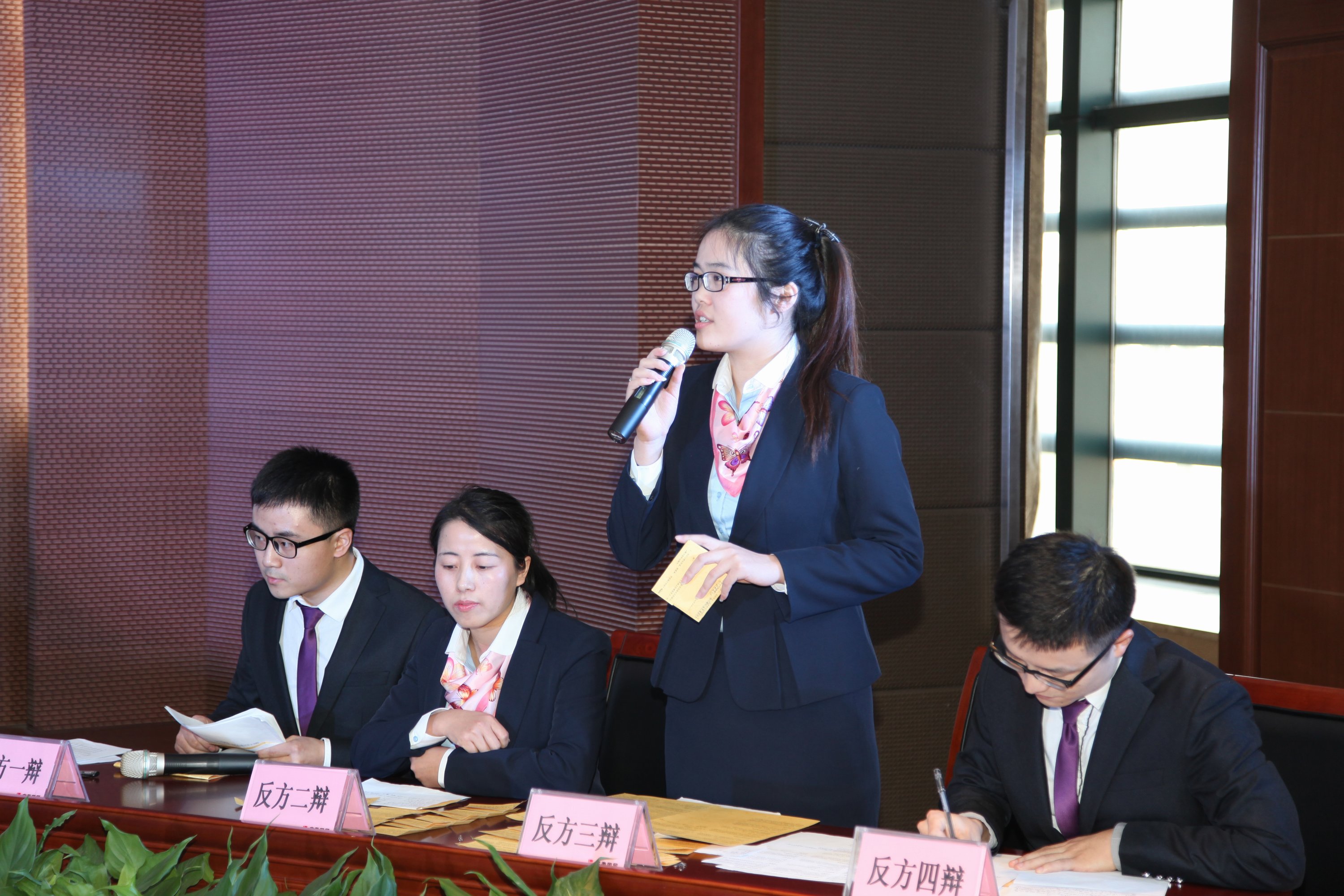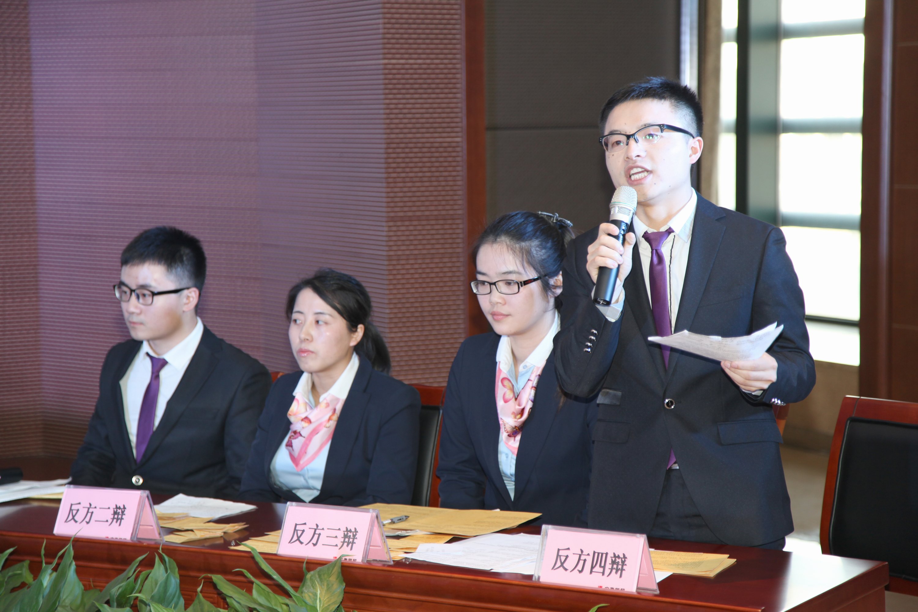 ? ? 預(yù)賽我司選手對陣的是輕工公司。輕工公司作為傳統(tǒng)強(qiáng)隊(duì),他們的重視程度可想而知,單從啦啦隊(duì)的人數(shù)上看,就具有壓倒性優(yōu)勢。兩家兄弟公司圍繞“上層和下屬需要保持距離才能樹立權(quán)威VS上層和下屬不需要保持距離才能樹立權(quán)威”這個(gè)辯題,展開了激烈的辯論。嵇博睿開篇立論有理有據(jù),條理清晰,如此沉著的表現(xiàn)給隊(duì)友們開了一個(gè)好頭。到了攻辯環(huán)節(jié),對方二、三辯分別對汪雪琴、徐曉倩提出一個(gè)又一個(gè)刁鉆的問題。她們從容不迫、淡定迎戰(zhàn),用平和的語氣給對方拋出問題,雖然語速不快,但一字一句都錯(cuò)落有致,擲地有聲。隨后的自由辯論更是緊張激烈,精彩紛呈。雙方辯友反應(yīng)機(jī)敏、幽默風(fēng)趣的表現(xiàn)引來現(xiàn)場觀眾和評委們的陣陣掌聲和笑聲。最后,范有春進(jìn)行了一段富有激情而又不失風(fēng)度的總結(jié)陳詞。陳詞演說清晰流暢,說理透徹,用語得體,將現(xiàn)場氣氛推向了高潮。我們的選手雖然是客場作戰(zhàn),但并沒有被主場強(qiáng)大的氣勢所壓倒,他們能夠結(jié)合國貿(mào)集團(tuán)的實(shí)際進(jìn)行提問和回答,如此接地氣的表現(xiàn)受到了集團(tuán)范總和副總經(jīng)理李明輝的高度評價(jià)。他們沉著冷靜、敢打敢拼的表現(xiàn)最終贏得了該場比賽的勝利,進(jìn)入半決賽。